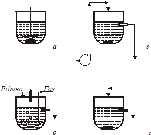 Збільшенню швидкості перебігу процесу сприяє диспергування і перемішування фаз. Обидва прийоми підвищують швидкість перенесення компонентів системи до поверхні розділу фаз. Диспергування припускає попереднє подрібнення частинок твердої фази і введення газу в рідину через дисперсійні перегородки (наприклад, фільтр Шотта). Можливості диспергування небезмежні, і в лабораторних умовах одержати пил або міхур газу розміром істотно нижче 0,1 мм важко. Принципи перемішування очевидні з рис.1: мішалка (а), циркуляція (б), протока (в, г).