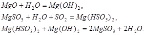 Диоксид серы в этом случае поглощают оксид – гидрооксидом магния. В процессе хемосорбции образуются кристаллогидраты сульфита магния, которые сушат, а затем термически разлагают на
