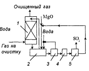 Рис. 1. схема установки очистки газа от диоксида серы суспензией оксида магния: 1 – абсорбер; 2 – нейтрализатор; 3 – центрифуга; 4 – сушка; 5 – печь.