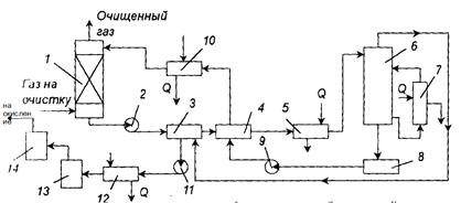 Рис.2. Схема установки очистки газа от сероводорода вакуум – карбонатном способом: 1 - абсорбер; 2, 9 – насосы; 3 – холодильник – конденсатор; 4 – теплообменник; 5 – подогреватель; 6 – регенератор; 7 – циркуляционный подогреватель; 10 – холодильник; 11 – вакуум – насос; 12 – холодильник; 13 – печь; 14 – котел – утилизатор.