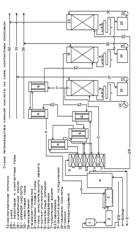 На схемі представлена схема виробництва сірчаної кислоти методом подвійного контактування (ДК) із природної або газової сірки, що не містить контактних отрут (з'єднань миш'яку, селен і ін.).