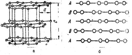 Рис. 1 Кристаллическая структура графита: а) модель графита, б) взаимное расположение слоев в гексагональной структуре
