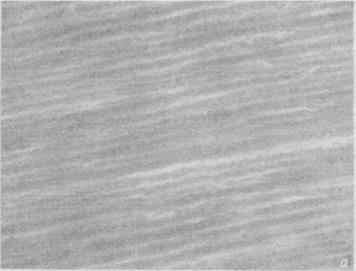 Электронно-микроскопическое исследование поверхности пленок МЦ и поверхности сколов, полученных в результате излома пленки, вдоль оси вытяжки при температуре жидкого азота позволило установить более мелкомасштабные детали строения пленок. При степенях вытяжки λ≤2.0 поверхность ориентированных пленок остается достаточно гладкой и ровной. Фибриллярная структура, видимая в оптический микроскоп, электронно-микроскопическим способом не обнаруживается. При λ≈2.2—2.5 на поверхности пленок появляется рельеф, образованный довольно регулярными и протяженными бороздами шириной 0.2—0.4 мкм, направленными перпендикулярно оси вытяжки. При сканировании перпендикулярно оси вытяжки (рис.1) видны поперечные складки шириной 0.3—0.5 мкм, а на некоторых участках обнаруживаются расслоения в виде микротрещин размером по ширине 0.1—0.2 мкм и длине 1.0—1.5 мкм, направленных параллельно оси вытяжки. При сканировании параллельно оси вытяжки кроме складчатой структуры становятся видимыми неровности с преимущественной ориентацией вдоль оси вытяжки. Изучение поверхности сколов обнаруживает наличие пористой структуры, размер пор колеблется от 0.1 до 1.0 мкм.