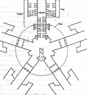 Радиальная упаковка субъедикиц IgМ, на одной из которых расположение гомологичных областей (доменов) L- (VL .и СL ) и H--цепей (VH , С1 m , С4 m ). Показаны наиболее важные продукты ферментативной фрагментации IgМ и предполагаемое положение J- цепи.