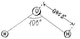 Хорошо изучено и измерено расположение ядер атомов водорода и кислоро-да и расстояние между ними. Оказалось, что молекула воды нелинейна. Вместе с электронными оболочками атомов молекулу воды, если на нее взглянуть “сбоку”, можно было бы изобразить вот так: