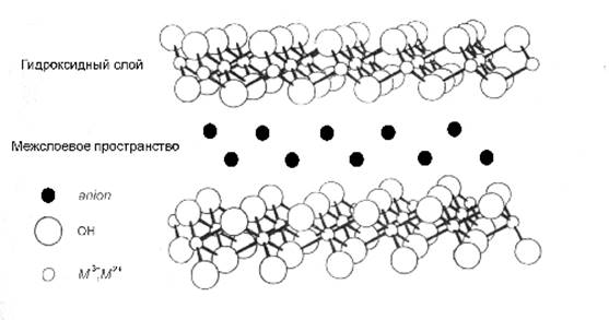 В работах [1-2, 5-7] указывается на возможность использования в качестве анионообменных материалов так называемых слоистых двойных гидроксидов (СДГ). Cтруктура СДГ (M2+ 1-x M3+ x (OH)2 [(anionn- )x/n . m H2 O]) состоит из положительно заряженных гидроксидных слоев (M2+ 1-x M3+ x (OH)2 )x + и анионов, находящихся в межслоевом пространстве. Интерес исследователей к этому классу соединений обусловлен возможностью вариации их свойств путем замещения анионов в межслоевом пространстве или атомов металла в гидроксидном слое.