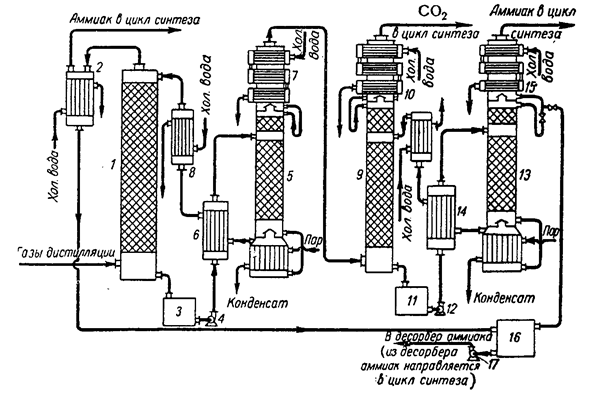 1,9 – абсорбційні колони; 2,10,15 – конденсатори; 3,11,16 – збірники;