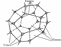 Газовые пузырьки в пенах разделены тончайшими пленками, образующими в своей совокупности пленочный каркас, который и служит основой пен. Такой пленочный каркас образуется, если объем газа составляет 80-90% общего объема. Пузырьки плотно прилегают друг к другу и их разделяет только тонкая пленка раствора пенообразователя. Пузырьки деформируются и приобретают форму пентаэдров. Обычно пузырьки располагаются в объеме пены таким образом, что три пленки между ними соединяются как это показано на рисунке.