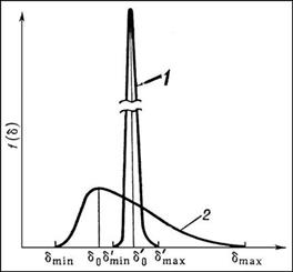 Кривые распределения объёма (массы) частиц по размерам: 1 — монодисперсная система; 2 — полидисперсная система. min, max, 0 — соответственно минимальный, максимальный и вероятнейший размер частиц; f() — функция распределения, доля объёма (или массы) дисперсной фазы, которая приходится на частицы с данным интервалом размеров, делённая на величину интервала.