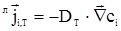 Турбулентный перенос массы можно рассматривать по аналогии с молекулярным как следствие хаотического перемещениявихрей. Вводится коэффициент турбулентной диффузии DT, зависящий как от свойств среды, так и от неоднородности скорости и удаленности от межфазной поверхности. При турбулентном движении, суммарный поток вещества относительно лабораторной системы, отсчета может быть записан