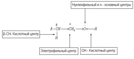 Отличие в физических свойствах между спиртами и многими другими классами органических соединений объясняется наличием в молекулах спиртов очень полярной гидроксильной группы. Входящий в нее атом кислорода, проявляя электроакцепторные свойства, «стягивает на себя» электронную плотность от связанного с ним атома водорода, и у последнего образуется дефицит электронной плотности. В результате этого между атомом водорода гидроксильной группы одной молекулы спирта и свободной электронной парой кислорода OH- - группы другой молекулы спирта возникает водородная связь, за счёт которой происходит ассоциация молекул спиртов. Спирты - бесцветные вещества с плотностью меньше единицы. Химические свойства спиртов проявляются в основном за счет гидроксильной группы.