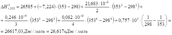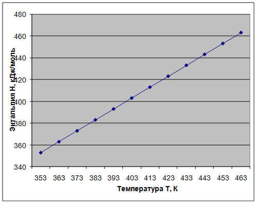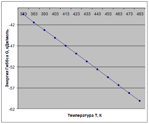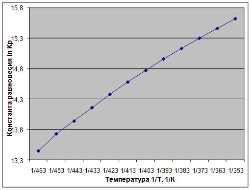 2. Термодинамический расчет показал, что реакция является эндотермической (ΔH > 0), протекает с небольшим поглощением тепла. Процесс характеризуется маленькими значениями Кр. С увеличением температуры константа равновесия увеличивается, а, следовательно, увеличивается выход продукта. В указанных условиях реакция протекает самопроизвольно, т.к. значения энергии Гиббса отрицательны (