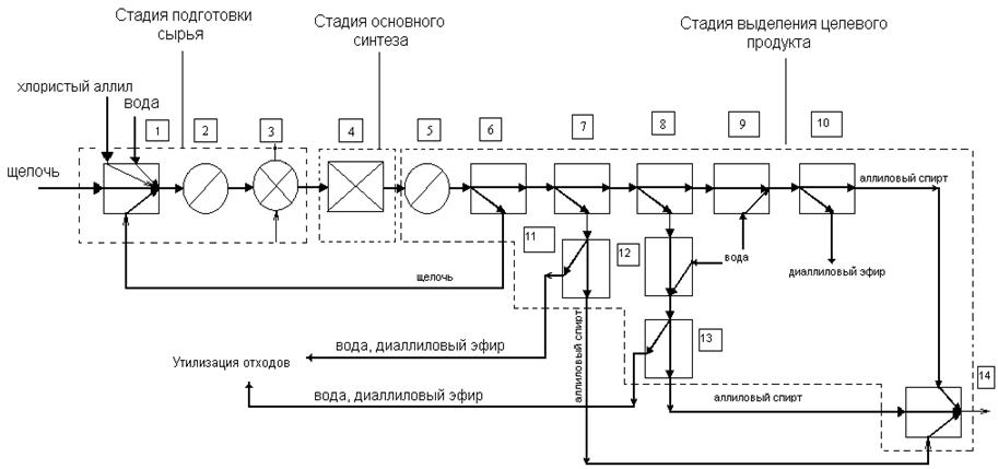 В процессе синтеза, с ректификационных колонн 7, 11, 13 аллиловый спирт поступает в сборник 14.