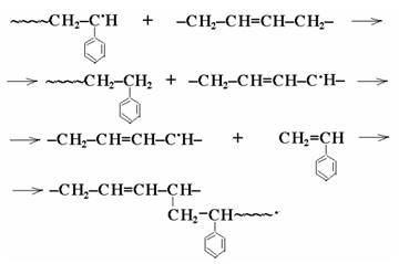Например, прививка стирола к полибутадиену идёт по схеме: