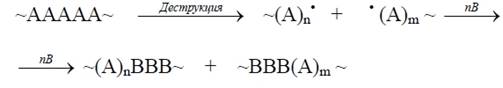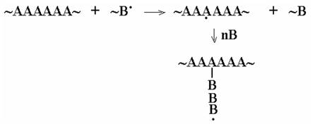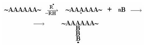 В результате в основной цепи полимера из звеньев А образуется радикал и происходит привитая полимеризация мономера В.