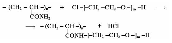 Другим примером образования фунциональных групп в макромолекуле полимера путем реакции полимераналогичных превращений является частичный щелочной гидролиз полиакриламида, который используется в промышленности для получения сополимера акриламида с акрилатом натрия: