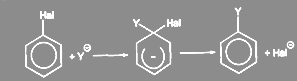 Обычно нуклеофильная замена галогена в ароматическом ядре протекает по биомолекулярному механизму SN Ar. В отличие от описанного для алкилгалогенидов реакция идёт не по синхронному механизму, так как атакующий нуклеофил способен образовывать новую связь раньше, чем порвётся старая, и первая стадия обычно определяет скорость всей реакции: