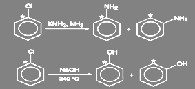 Подобные интермедиаты представляют собой устойчивые соли, называемые солями Мейзенгеймера, со времени обнаружения их в 1902 г было выделено большое число таких солей, строение нескольких интермедиантов такого типа было подтверждено данными ЯМР и pентгеноструктурного анализа. Однако описанный механизм не является единственно возможным. С помощью меченого атома углерода было показано что в арилгалогенидах, не содержащих активирующих групп, замещающая группа становится не только к тому атому углерода, где был галоген, но в равной степени и к соседнему атому: