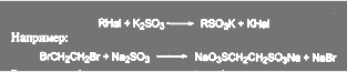 Выходы сульфокислот составляют 70-90 % при использовании первичных алкилгалогенидов 20-25% для вторичных. Третичные алкилгалогениды превращаются в олефины. В реакцию вступают также галогензамещённые кислоты, спирты, кетоны и ароматические соединения с подвижным галогеном:
