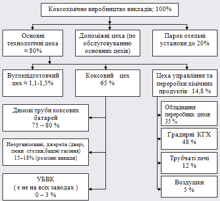 Схема 5.1 Розподіл викидів забруднюючих речовин по цехам коксохімічного виробництва