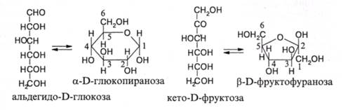 В последнем случае большое значение имеет способность Сахаров образовывать циклические структуры, что иллюстрируется ниже на примере глюкозы и фруктозы: