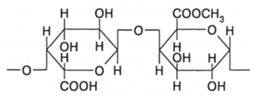 Прочность стволов и стеблей растений, помимо скелета из целлюлозных волокон, определяется соединительной растительной тканью. Значительную ее часть в деревьях составляет лигнин - до 30 %. Его строение точно не установлено. Известно, что это относительно низкомолекулярный (М ~ 104 ) сверхразветвленный полимер, образованный в основном из остатков фенолов, замещенных в орто -положении группами -ОСН3 , в пара -положении группами -СН=СН-СН2 ОН. В настоящее время накоплено громадное количество лигнинов как отходов целлюлозно-гидролизной промышленности, но проблема их утилизации не решена. К опорным элементам растительной ткани относятся пектиновые вещества и, в частности пектин, находящийся в основном в стенках клеток. Его содержание в кожуре яблок и белой части кожуры цитрусовых доходит до 30%. Пектин относится к гетерополисахаридам, т.е. сополимерам. Его макромолекулы в основном построены из остатков D-галактуроновой кислоты и ее метилового эфира, связанных a -1,4-гликозидными связями: