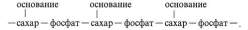 Как уже упоминалось выше, звенья нуклеиновых кислот, называемые нуклеотидами, содержат остатки фосфорной кислоты, сахара и оснований. Образование цепи из нуклеотидов происходит в результате катализируемой ферментами конденсации групп -ОН остатков сахара и фосфорной кислоты. В результате макромолекулы всех нуклеиновых кислот имеют цепи с регулярным чередованием остатков сахара и фосфорной кислоты, что схематически может быть представлено следующим образом: