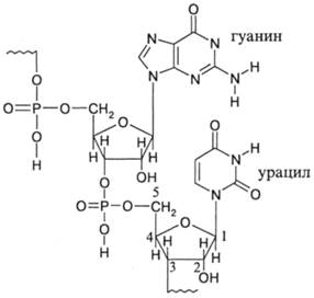 Сахара относятся к группе пентоз (см. полисахариды в этом же разделе), основания - к рядам пиримидина и пурина. Упомянутые соединения представлены на схеме. Каждая из нуклеиновых кислот построена из четырех типов нуклеотидов, которые отличаются химической природой основания. ДНК содержит два основания пуринового ряда - аденин и гуанин и два основания пиримидинового ряда - цитозин и тимин. В РНК пуриновые основания те же, пиримидиновые основания несколько отличаются, это цитозин и урацил. Все эти основания присутствуют на приведенных далее схемах, на первой из них изображен фрагмент макромолекулы РНК: