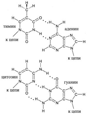 В 1953 г. Уотсон и Крик установили, что ДНК образует вторичную структуру в виде двойной спирали. Такая спираль образуется при скручивании двух макромолекул ДНК вокруг общей оси и фиксируется водородными связями между основаниями, связанными с разными цепями. Всегда попарно связываются пуриновые и пиримидиновые основания, поскольку только при этом условии сечение двойной спирали остается неизменным по длине. Исходя из принципа достижения максимальной энергии водородных связей, всегда оказываются попарно связанными тимин с аденином и цитозин с гуанином. Из схемы видно, что только в этой комбинации образуется максимальное количество водородных связей из числа возможных, и их энергия близка к максимальной, поскольку три атома, связанные водородной связью, во всех случаях лежат на линии, близкой к прямой: