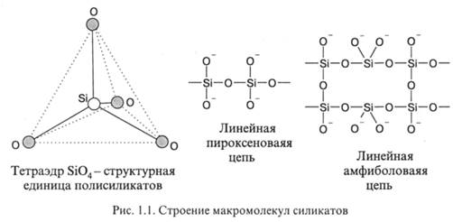 На рис. 1.1 представлены также фрагменты макромолекул линейных и двухмерно сшитых линейных двухтяжевых полисиликатов. Такие структуры могут быть получены при сочетании тетраэдров SiO2 вершинами, при этом, ионам кислорода должны соответствовать свободные вершины. Слоистые структуры SiO4 образуются при сочетании тетраэдров ребрами, при этом один атом кислорода должен оставаться свободным. Линейные макромолекулы SiO2 входят в состав минералов пироксен, энстатит, диопсид, сподумен, амфиболит, тремолит и др. Последние составляют основу природного волокнистого неорганического материала, известного как асбест. В состав многих минералов входят слоистые полимерные структуры SiO2 , например в состав талька и каолинита (белой глины), где они чередуются со слоями полимерных гидроксида магния - в первом случае и гидроксида алюминия - во втором.