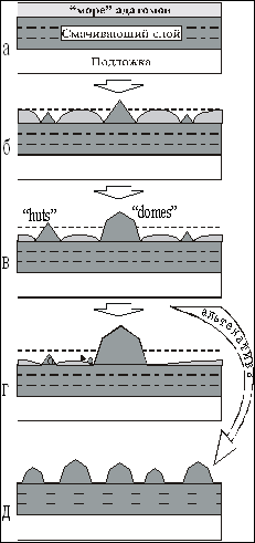 Рис.1 схематично показывает основные этапы образования ансамбля напряженных островков. В начальном состоянии (а) на поверхности имеется пересыщенный адсорбат, но теперь он образовался на поверхности подстилающего (смачивающего) слоя напыляемого материала (Ge). Зарождение 3D - "hut"-кластеров (позиция (б)) обусловлено релаксацией упругих деформаций. Далее (позиция (в)) появляются две выделенные формы: "hut" и "dome". Энергетическая выгодность первой и второй форм зависит от их объема, но возможно их сосуществование. Возможен переток атомов к более энергетически выгодной форме (позиция (г, но: нет непрерывного распределения по размерам, а наблюдается бимодальность в распределении); в работе [] наблюдался обратный пере ход от "dome" к "hut". Возможно квазиравновесное состояние системы, когда размеры и форма кластеров практически не изменяются во времени при отсутствии внешнего потока (позиция (д)). Вероятность стабильного состояния ансамбля островков возрастает с увеличением анизотропии поверхностной энергии (ее возрастанием на фасеточных гранях островков). При определенных условиях (близкое расположение островков) теоретически обосновано взаимодействие кластеров через перекрывающиеся поля упругих деформаций в подложке [,], что может способствовать упорядочению пространственного распределения островков на поверхности.