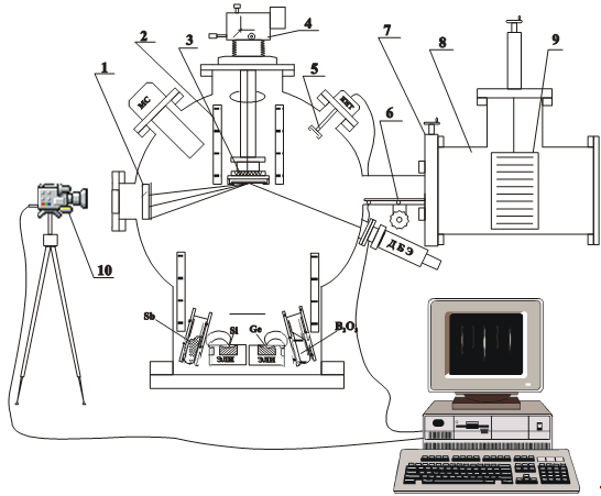1. - Люминесцентный экран. 2. - Криопанель. 3. - Нагреватель. 4. - Манипулятор. 5. - Кварцевый измеритель толщины. 6. - Рейка для транспортировки подложек. 7. - Шибер. 8. - Камера МЗВ. 9. - Манипулятор с кассетами. 10. - Система регистрации ДБЭ.