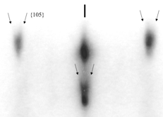 Как уже указывалось выше, в этой области толщин наблюдаются дифракционные картины, свидетельствующие об образовании псевдомофных "hut" кластеров с ориентацией граней типа {105}.