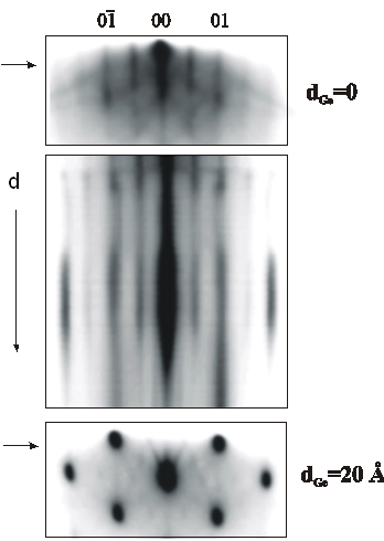 По мере падачи материала на поверхность, трехмерные островки увеличиваются в размерах. "Hut" островки, будучи когерентно сопряжены в своем основании с подстилающим слоем, имеющим в плоскости роста параметр решетки кремния, к своей вершине постепенно релаксируют. И чем больше размер островка, тем большие толщины подвержены релаксации. "Dome" островки срелаксированны еще больше. При некоторой толщине пленки введенные в "dome" островки дислокации несоответсвия уже настолько снимают напряжения в островках, что электронный луч прошедший через островок "чувствует" в нем параметр решетки объемного германия.
