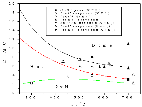 Таким образом из анализа изменения горизонтального и вертикального профиля интенсивности дифракционной картины можно выделить три характерные толщины растущей пленки: (1) – переход от двумерного роста к трехмерному и начало образования на поверхности "hut" островков, (2) – переход "hut"островков в "dome" и (3) – полная релаксация "dome" островков.На рис.14 представлена кинетическая диаграмма морфологии поверхности пленки Ge на Si(100) в процессе роста, в зависимости от эффективной толщины осажденного германия и температуры роста.