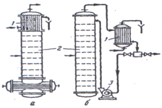 В случае полной конденсации паров в дефлегматоре его устанавливают выше колонны, непосредственно на колонне или ниже верха колонны для того, чтобы уменьшить общую высоту установки. В последнем случае флегму из дефлегматора 1 подают в колонну 2 насосом. Такое размещение дефлегматора часто применяют при установке ректификационных колонн вне зданий, что более экономично в условиях умеренного климата.