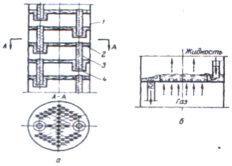 а - схема устройства колонны; б – схема устройства тарелки; 1 - корпус; 2 - тарелка; 3 - переливная труба; 4 - стакан.