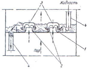 Кипятильник или куб, предназначен для превращения в пар части жидкости, стекающей из колонны, и подвода пара в ее нижнюю часть (под насадки или нижнюю тарелку). Кипятильники имеют поверхность нагрева в виде змеевика или представляют собой кожухотрубчатый теплообменник, встроенный в нижнюю часть колонны. Более удобны для ремонта и замены выносные кипятильники, которые устанавливают ниже колонны с тем, чтобы обеспечить естественную циркуляцию жидкости.
