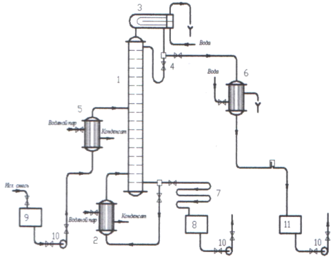 Принципиальная схема ректификационной установки представлена на рис. Исходная смесь из промежуточной емкости 9 центробежным насосом 10 подается в теплообменник 5, где подогревается до температуры кипения. Нагретая смесь поступает на разделение в ректификационную колонну / на тарелку питания, где состав жидкости равен составу исходной смеси ХF.