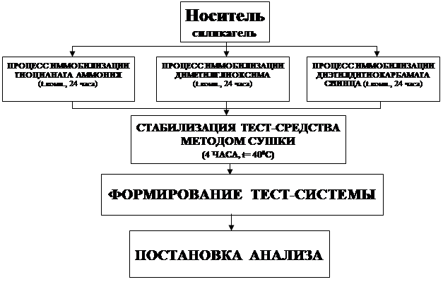 Разработанная тест-система представляет собой твёрдофазный носитель на основе силикагеля, на поверхности которого адсорбирован диметилглиоксим, диэтилдитиокарбамат свинца и тиоцианат аммония. Выбор носителя был обусловлен положительными свойствами твердой фазы. Гранулы, входящие в состав сорбента отличаются однородностью состава, механической прочностью, микробиологической устойчивостью и хорошей проницаемостью. Качественный анализ содержания никеля, кобальта и меди в объектах внешней среды предоставляет большие возможности химикам-аналитикам и ученым экологам в исследовательской деятельности. Тест-система позволит создать средств анализа недорогие лёгкие с точки зрения использования и в то же время сопоставимые по своим аналитическим характеристикам с современными инструментальными методами.