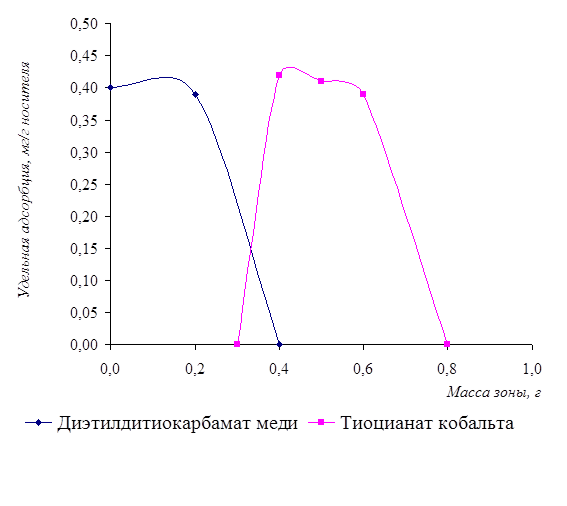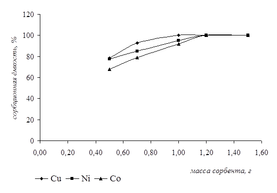 Из графика видно, что максимальная сорбционная ёмкость по ионам кобальта и никеля наблюдалась при массе сорбента 1,2 г, а по ионам меди – 1г. Выбор концентрации растворов исследуемых ионов для постановки данного анализа был обусловлен валовым содержанием этих элементов в объектах окружающей среды.
