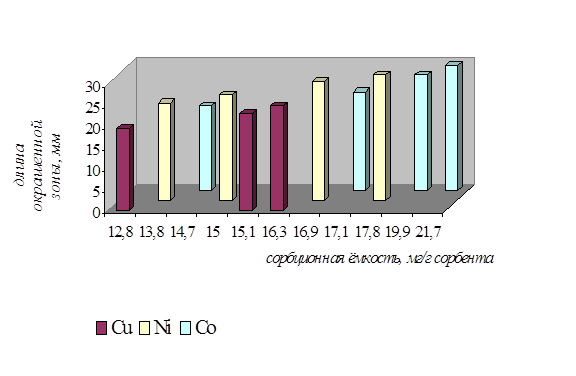 Сорбционная ёмкость влияет на длину окрашенной зоны. В основу количественного определения элементов по величине окрашенной зоны положена особенность, связанная с равномерным распределением веществ в зоне, т.е. пропорциональная зависимость между размерами зон и концентрацией исследуемого раствора. Для этого нами было проведено исследование зависимости длины окрашенной зоны от концентрации анализируемого иона в растворе. Сорбент с иммобилизованным комплексообразователем помещали в стеклянную трубку диаметром 10 мм и длиной 100 мм. Через полученную систему пропускали раствор анализируемого иона известной концентрации. Наблюдалось развитие окраски тест-средства в результате взаимодействия комплексообразователя, закреплённого на носителе с исследуемым ионом.
