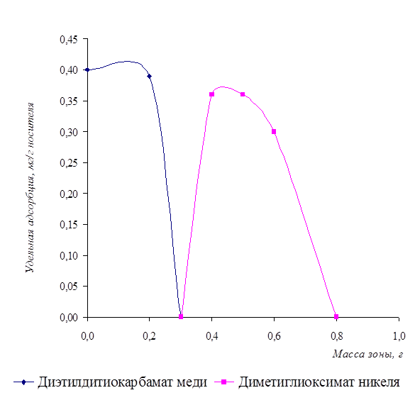 Из рисунка 8 видно, что более растворимый осадок переходит в более подвижную фазу и содержание его в верхней зоне уменьшается. Теоретически разделение осадков диэтилдитиокарбамата меди и диметилглиоксимата никеля должно быть успешным, так как граница в их растворимости составляет более 103 и не зависит от концентрации анализируемых ионов.