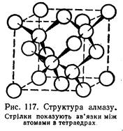 Алмаз — безбарвна, прозора речовина, яка сильно заломлює світлові промені. Він кристалізується в кубічній гранецентрованій решітці. При цьому одна половина атомів розміщується у вершинах і центрах граней одного куба, а друга — у вершинах і центрах граней другого куба, зміщеного відносно першого у напрямі його просторової діагоналі. Атоми карбону в алмазі перебувають у стані sр3- гібридизації і утворюють тривимірну тетраедричну сітку, у якій вони зв'язаніодин з одним ковалентними зв'язками 1. Відстань між атомами в тетраедрах дорівнює 0,154 нм. Структуру алмазу показано на мал. 1.