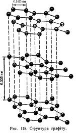 В утворенні зв'язків беруть участь три електрони кожного атомакарбону. Четвертий електрон зовнішнього шару займає 2р-орбіталь,яка не бере участі в гібридизації. Такі негібридні електронні хмариатомів карбону орієнтовані перпендикулярно до площини шару і,перекриваючись одна з одною, утворюють делокалізовані p-зв'язки.структуру графіту показано на рис. 118.