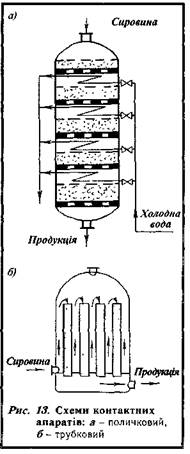 2. Трубкові апарати. У трубкових апаратах (рис. 13,б) сировина (газ) і теплоносій (під час ендотермічних реакцій) або охолодник (під час екзотермічних реакцій) рухаються назустріч один одному. Нагрівання або охолодження відбуваються безперервно протягом усього каталізного процесу.