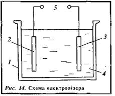Електролізер (рис. 14) складається з ванни 1 , викладеної з середини кислотостійкими матеріалами, електродів (анода 2 й катода 3), допоміжних механізмів і пристроїв. Через електроліт (розчин або розплав) 4, яким заповнюють ванну, від позитивного електрода (анода) до негативного (катода) проходить постійний електричний струм від джерела струму 5.
