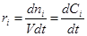 Скорость реакции. Изменение количества молей i-того участника стадии (∆ni ) в результате химической реакции определяется скоростью ri образования или расходования ni , временем реакции t и объемом V:Dni = j(ri , t, V). Поэтому скорость реакции ri есть производная второго порядка от ni по V и t: