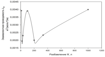 Зная зависимость эквивалентной эл. проводимости от разведения и удельной проводимости, можно рассчитать значения λ V и построить график зависимости λ V =f (V ):