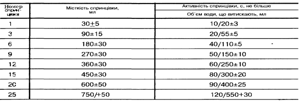 Місткість та активність спринцівок в залежності від номеру повинні відповідати даним наведеним в таблиці 1.